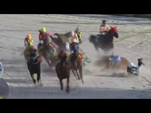 4コーナーで2番手から先頭に立とうとした中島龍也ジョッキー騎乗の10番クリノヴァニラ号が前に躓き中島ジョッキーが顔から勢いよく落馬した。
